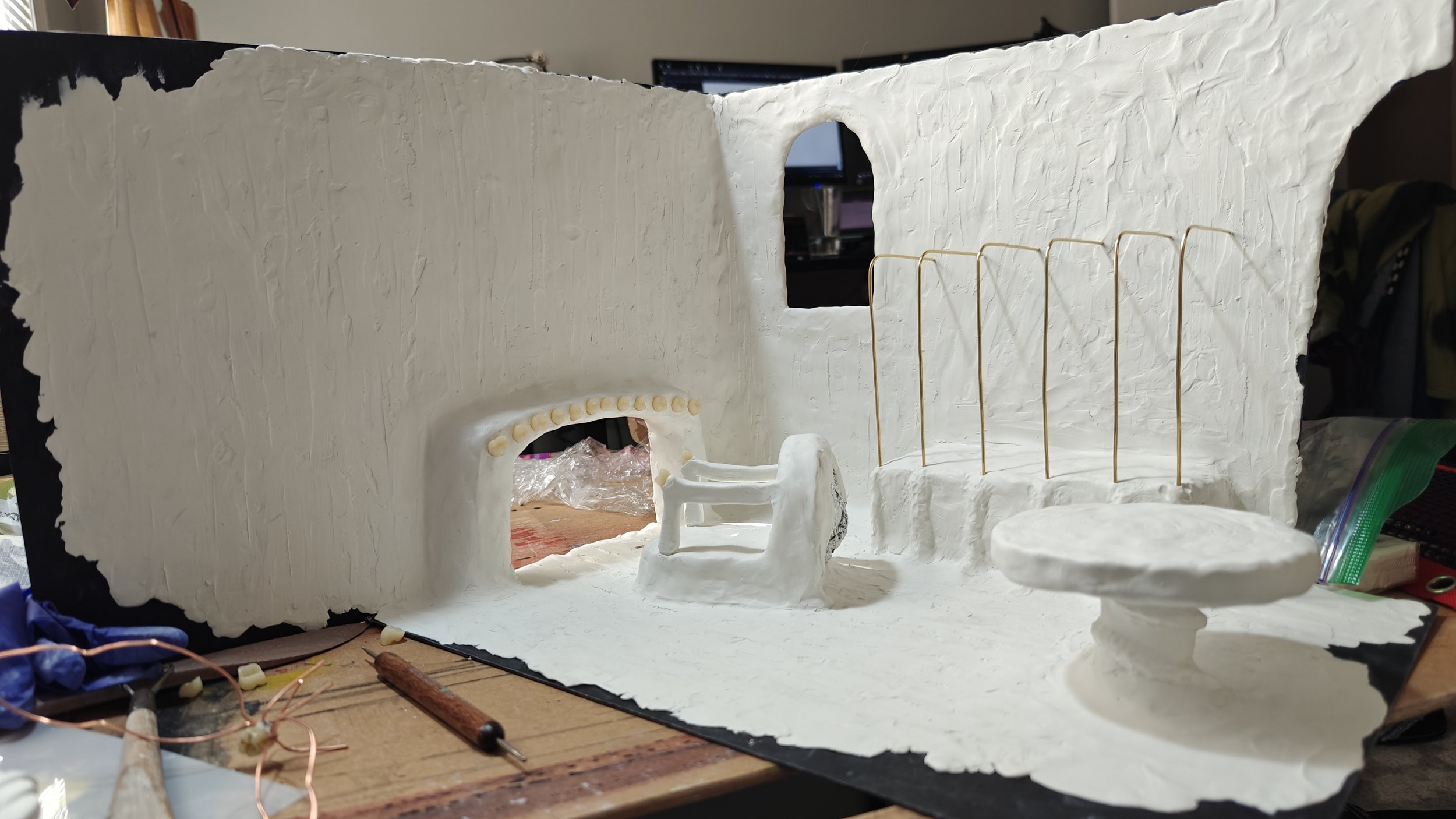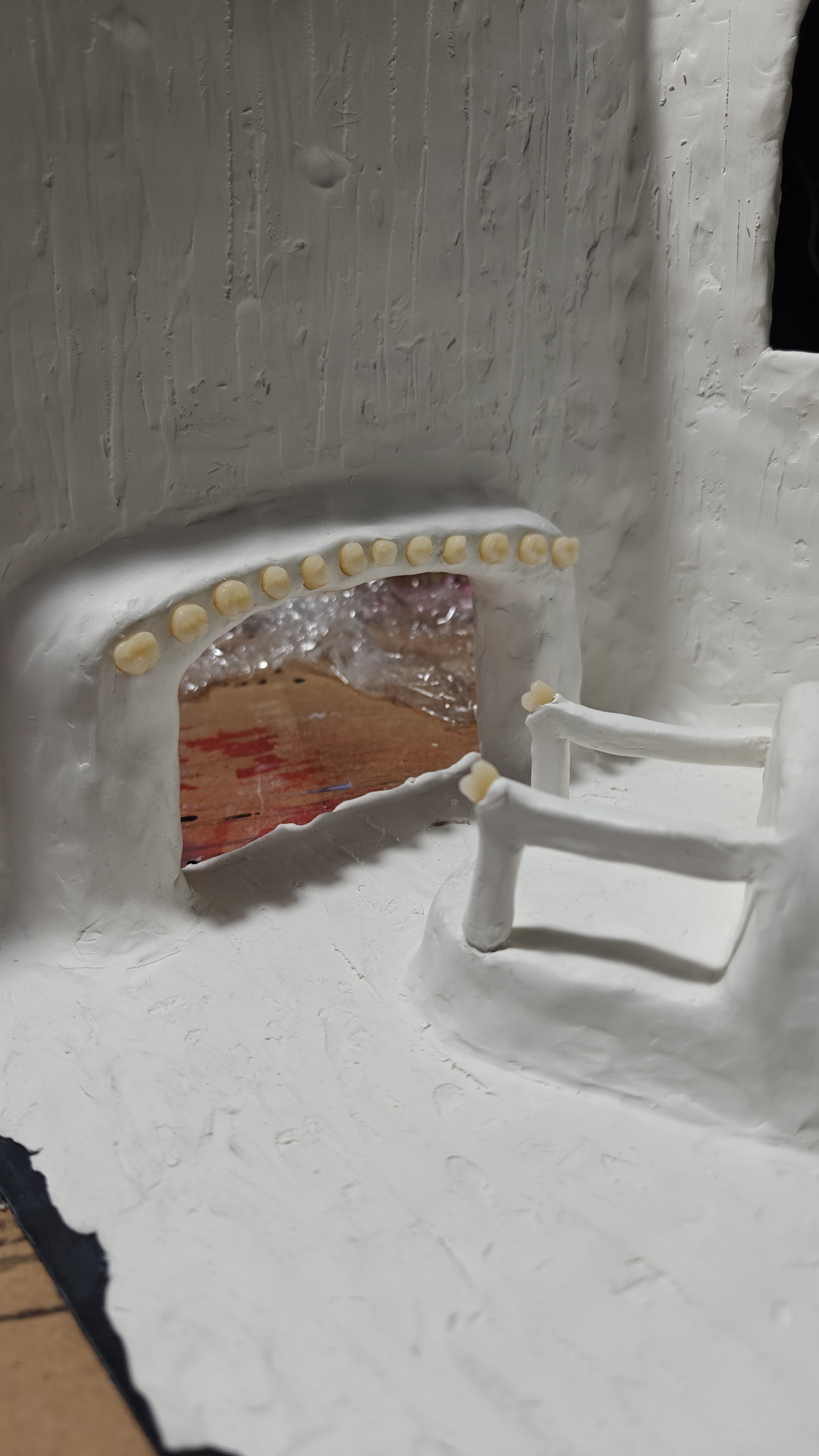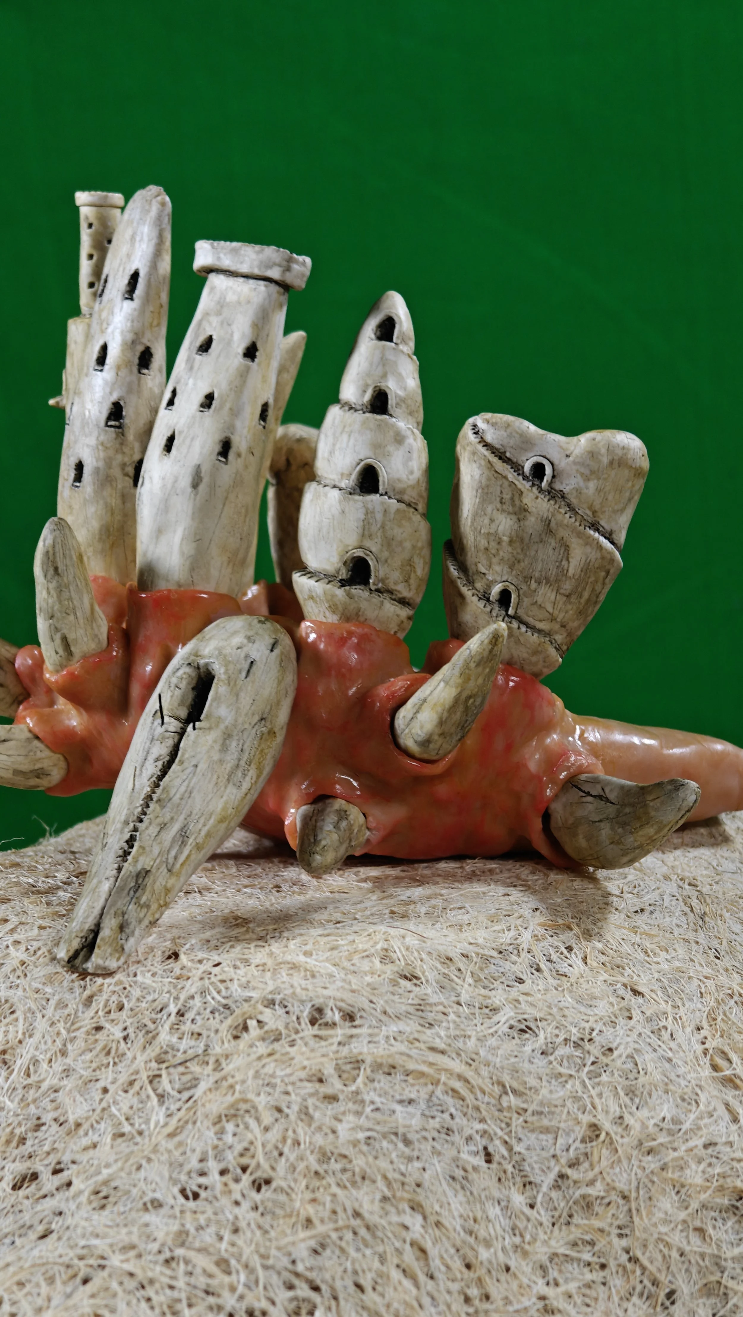 I really wanted to make sure the structure was clearly both a castle and a set of teeth— which turned out to be more of a challenge than anticipated. Teeth, as it so happens, are strangely both biomorphic and geometric in form and shape, and I found myself oscillating quite a bit between creating hard edges and softer, blended forms.
