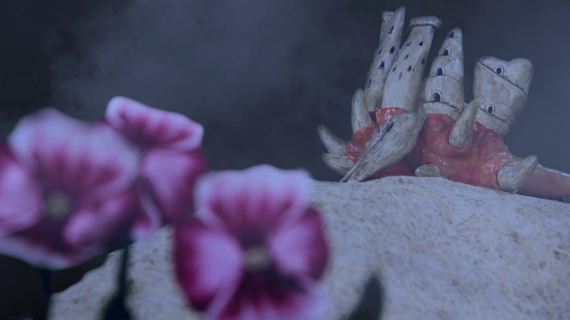 The final decision was how to render the main entrance; I wanted something to illicit a drawbridge or raiseable gate of some kind, but also being acutely aware of the horrifying nature of the act itself I wanted to find the most unsettling way possible to include it— should the teeth move? Should they be in positions that felt unnatural? I finally landed on pushing one of the largest front teeth into a downward-facing orientation, to turn it into a kind of ramp that could lift up and over a mote if I so wished (I ended up not creating a mote for the castle, but the entrance tooth was still effective).
