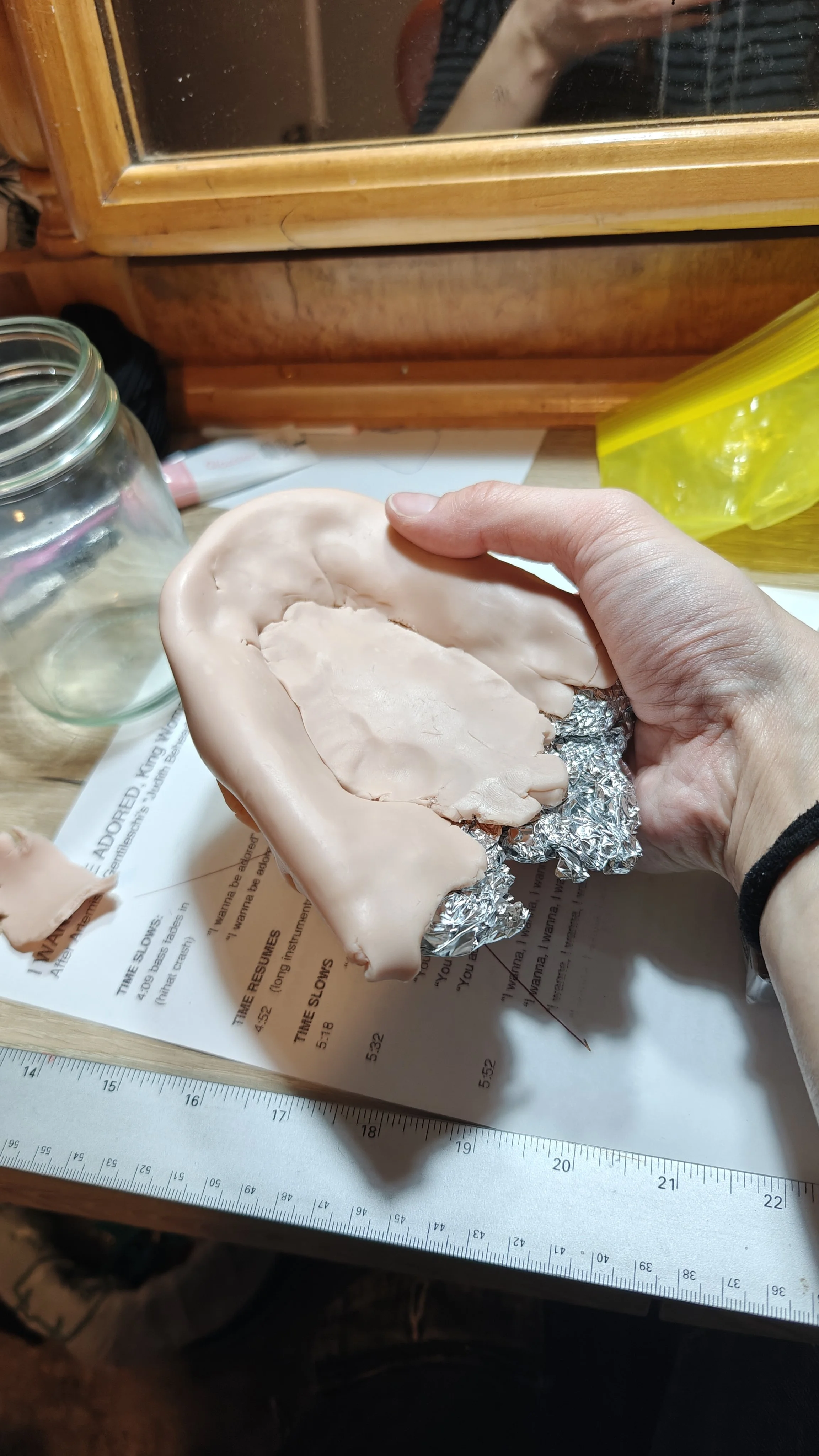 I wanted to use clay for this project in part to get the gums and teeth to look as organic as possible without being completely photorealistic. In order to get those gums to be super fleshy, I mixed in a bit of pink with my skintone clay, and after baking I gave it a few wash layers with reds and yellows and pinks to make it look more mottled. The teeth themselves were a blend of white and beige clay, which I then scored and distressed using an absolutely cursed mix of old watered-down paints and stale coffee. This worked particularly well in areas like the creases between steps and in the score marks I made along the biting edges.